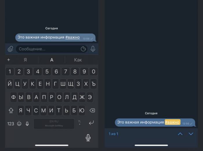 Чтобы найти запись в личном чате, используют поиск внутри самого диалога. Требуется ввести хештег, связанный с сообщением, и выбрать нужный вариант.