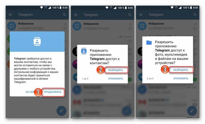 Далее Телеграм предложит настроить синхронизацию с контактами, которые хранятся в вашей телефонной книге. Для этого необходимо выдать разрешение, еще одно разрешение запрашивает доступ к файлам, чтобы пользователь мог обмениваться информацией.