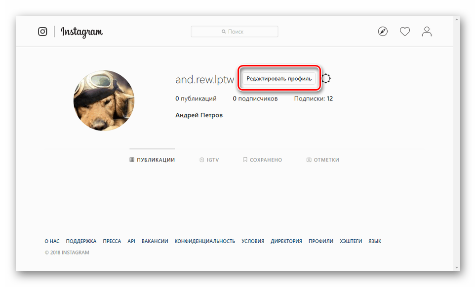 - Кликаем на надпись «Редактировать профиль», которая расположена справа от имени вашего аккаунта.
