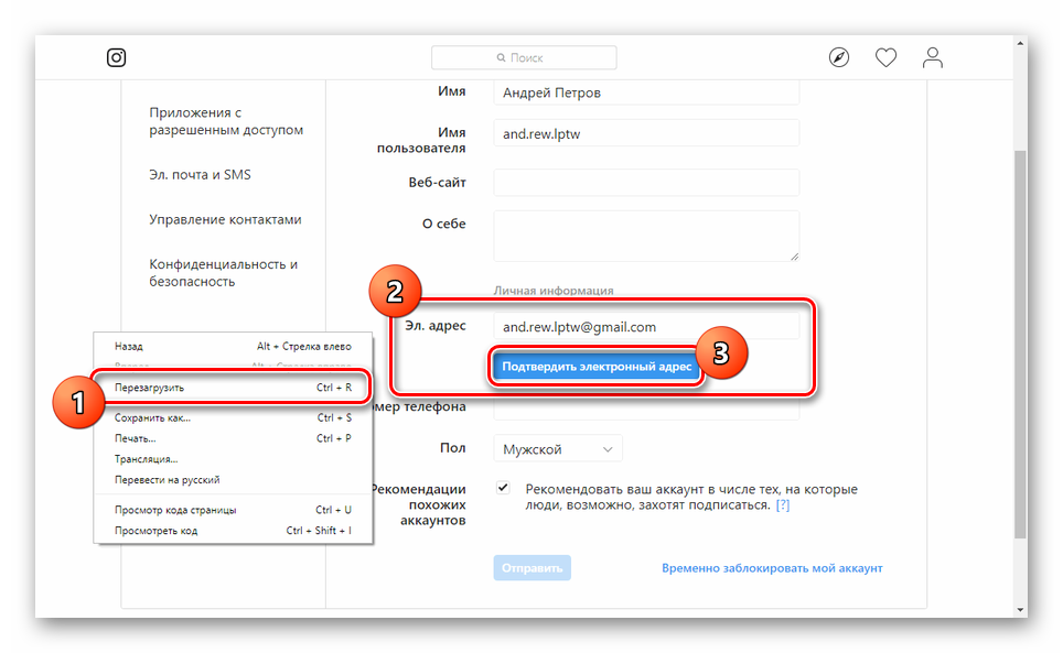 С помощью клавиши «F5» или контекстного меню браузера выполните перезагрузку страницы. Рядом с полем «Эл. адрес» кликните по «Подтвердить электронный адрес».