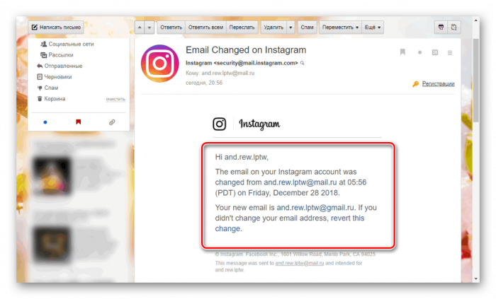 Не удивляйтесь, что у вас будет отправлено сообщение именно от фейсбука, а не от инстаграма. В сообщение будет специальная ссылка, благодаря которой вы попадете на специальную страницу для создания нового пароля.