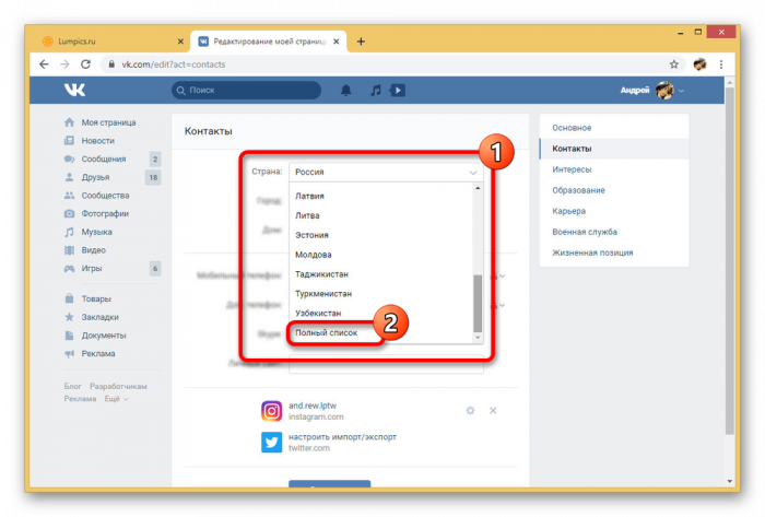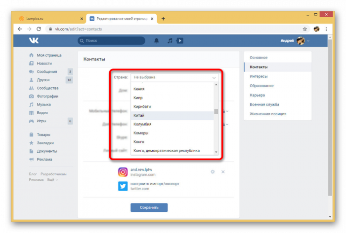 Через вспомогательное меню в правой части окна откройте вкладку «Контакты» и найдите пункт «Страна». Для ознакомления с вариантами необходимо кликнуть по блоку с выпадающим списком.