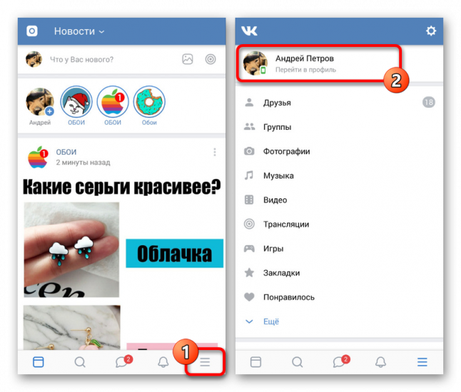 - перейти в собственный профиль;