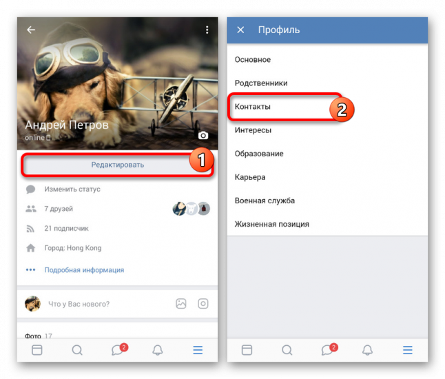 По аналогии с веб-сайтом, под фотографией нажмите кнопку «Редактировать» и через представленный список разделов откройте «Контакты».
