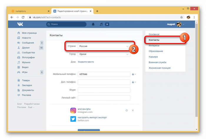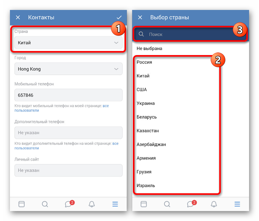 В случае с приложением ВКонтакте для мобильных платформ изменение страны несколько усложняется из-за менее удобного расположения разделов. Однако в плане предоставляемых настроек такой вариант вполне можно использовать для изменения как страны проживания, так и любых других данных из блока «Контакты» на странице.