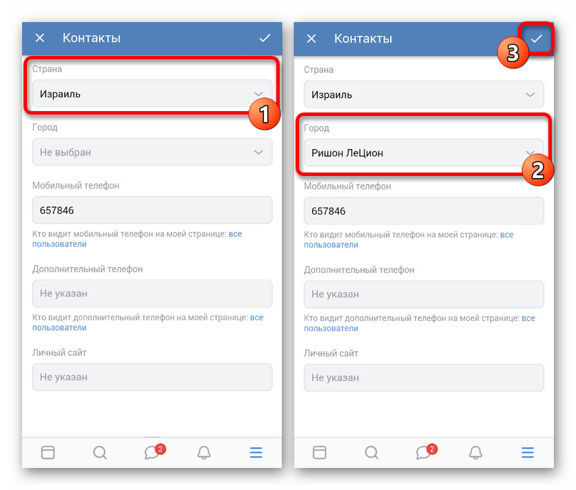 Указав желаемую страну, по необходимости сделайте похожее в блоке «Город» и нажмите по значку с галочкой в правом верхнем углу экрана. В результате настройки будут сохранены, обновив вместе с тем данные на странице.