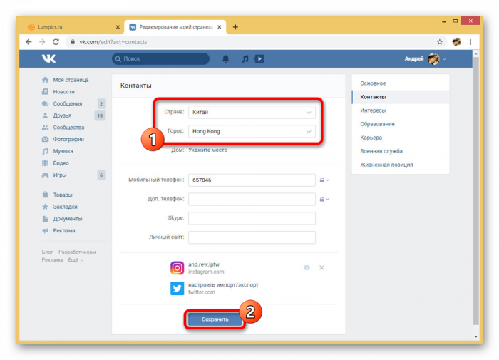 На официальном веб-сайте ВКонтакте произвести изменение страны можно с помощью инструментов редактирования страницы. При этом процесс напрямую связан с городом проживания, так как данные из блока «Контакты» меняются в одной и том же разделе параметров.
