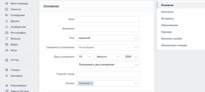 Нетрудно догадаться, что здесь также нельзя использовать какую-то несуществующую информацию, так как список ограничен реальными вариантами. При этом страну, равно как и город, можно вовсе не указывать или скрыть через настройки приватности.