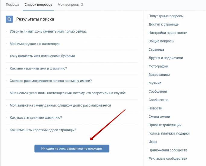 в поисковой строке ввести суть проблемы, например, фразу «не получается сменить имя»;