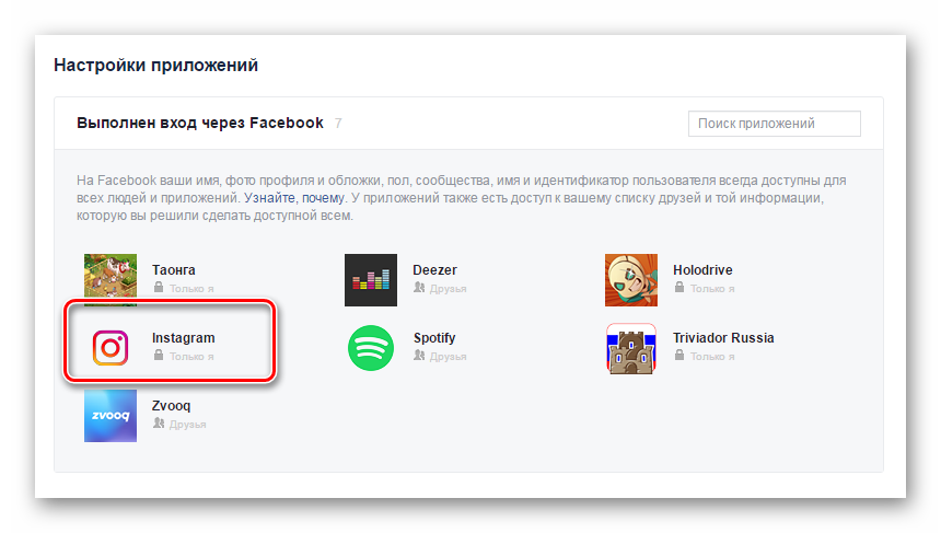 Перед вами появятся приложения, в которые вы выполняли вход через Facebook. Поэтому, если вы регистрировались в Инстаграм через свой профиль в Фейсбук, то приложение автоматически высветится, а если регистрация производилась по-другому, но через тот же электронный адрес, то просто выполните вход в Инстаграм через Фейсбук. После чего приложение появится в списке.