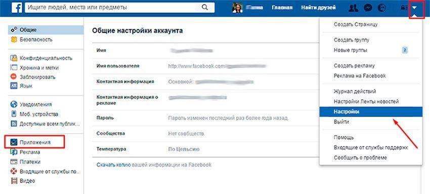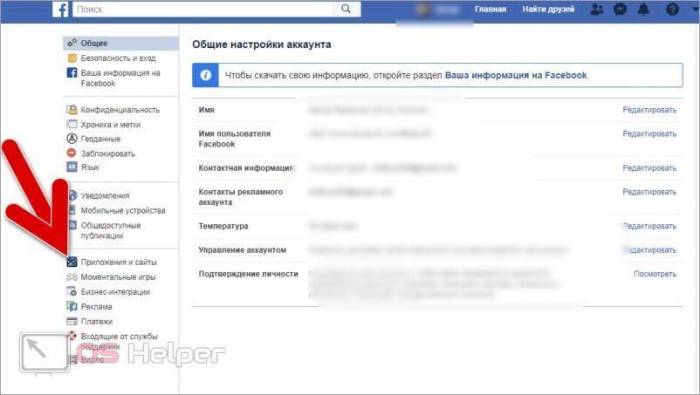 - На Фейсбуке переходим в раздел с настройками, выбираем строку «Приложения».