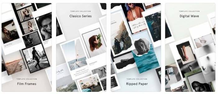 Unfold сходна с Jane, однако заточена специально под сторис. Минималистичный дизайн шаблонов, 5 шрифтов, возможность соединять фото и видео, белые рамки – отличительные черты этой программы для коллажей. Регистрация не требуется. Программа работает на русском языке. Есть платные шаблоны.