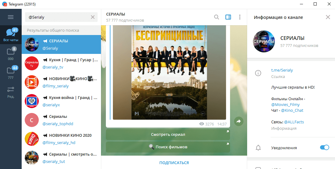 @Serialy – канал, посвященный сериалам. Он имеет интерактивную составляющую. Аудитория может не только прочитать описание, но и кликнуть «Смотреть сериал». Авторы сотрудничают с другими каналами и иногда пересылают из них сообщения.