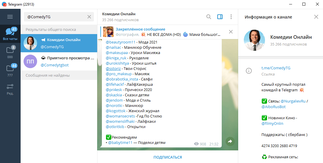 Если хочется посмеяться, стоит обратить внимание на @ComedyTG. Это самый крупный канал, работающий с этим жанром