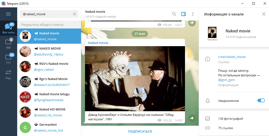 @kinopoisk – официальный канал одноименного сайта. Здесь можно найти новости про кино. Они затрагивают не только премьеры, но и личную жизнь актеров и режиссеров. Каждая новость сопровождается фотографией и ссылкой на источник, перейдя по которой можно получить более подробную информацию.