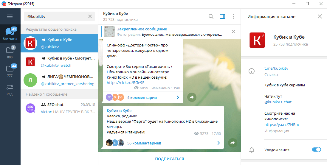 Студия озвучки @kubikitv запустила свой канал. Основной контент – сериалы. После того, как эпизод озвучивается, создатели отправляют сообщение. Это удобнее, чем следить за выходом серий и озвучки самостоятельно.