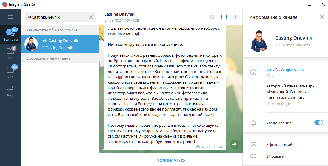 @CastingDnevnik – нестандартный канал. Его создала Эльвира Меликова. Он рассчитан на актеров и тех, кто хочет попробовать себя в этой сфере. Подписчики ежедневно получают полезную информацию, большая часть которой – советы.