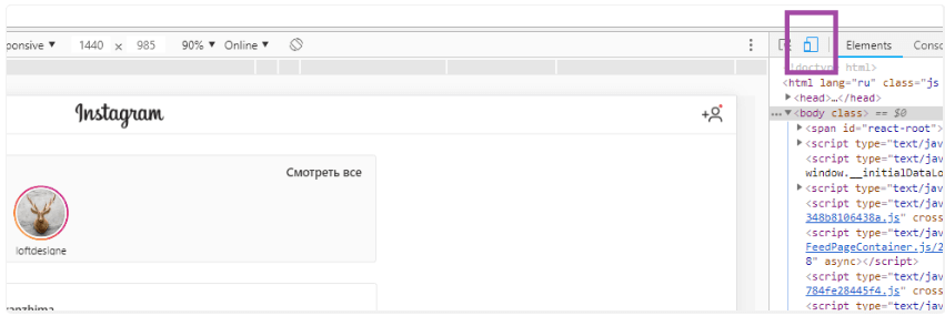 В открывшейся панели переключитесь на мобильную версию, нажав на значок планшета и смартфона (два прямоугольника, которые должны стать синими).