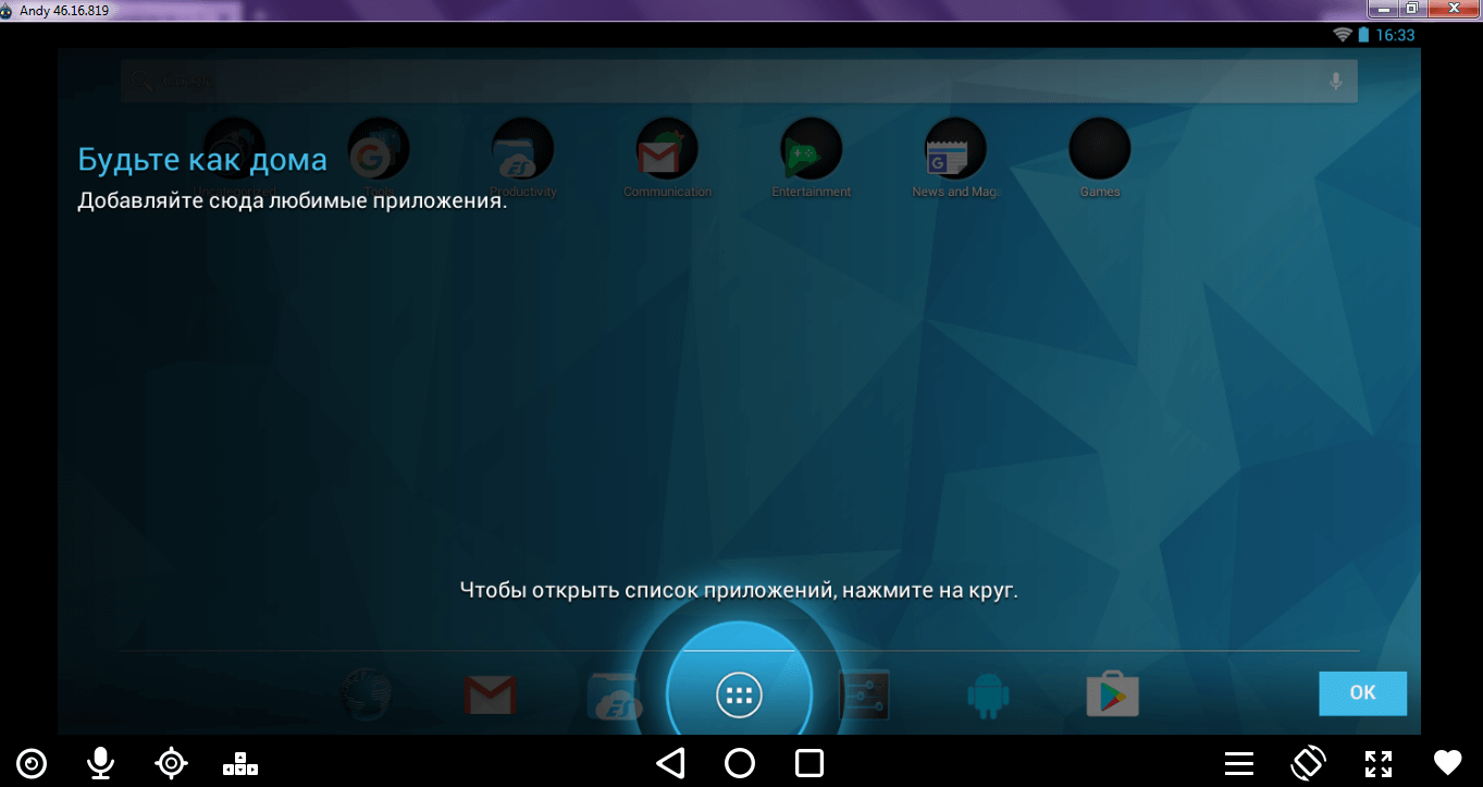 Установленная на компьютер программа заставит соцсеть воспринимать компьютер, как мобильное устройство. Возьмём в качестве примера эмулятор под названием Andy (остальные скачиваются и настраиваются аналогично).