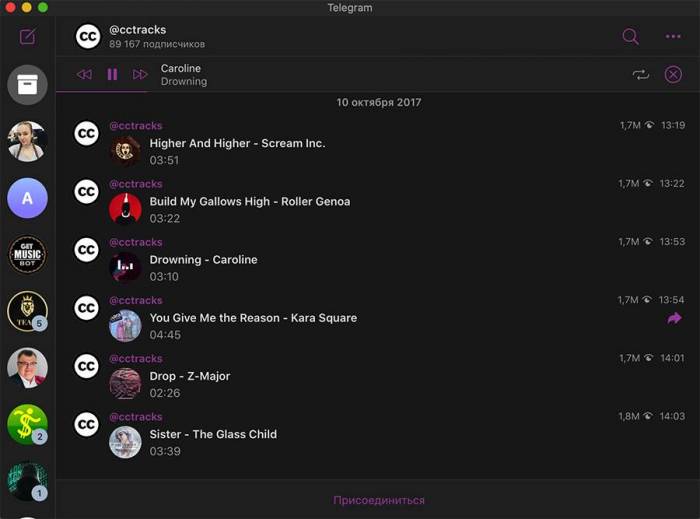 Чтобы посмотреть текущий плейлист, в версии Telegram для компьютеров следует навести курсором на название проигрываемого трека сверху диалогового окна. Вы увидите список всех загруженных аудиозаписей в открытом чате.