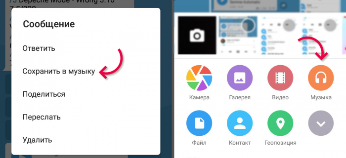 Загрузка музыки в telegram из памяти телефона осуществляется тоже достаточно легко. Но есть небольшие отличия при использовании смартфонов с разными операционными системами.