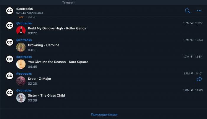 Как в Телеграмме найти музыку с помощью каналов? Аналогичным способом, как это выполняется в чатах. Только сперва необходимо присоединиться к нужной группе, а уже далее — тапнуть на название «комнаты», открыть список композиций и ввести поисковый запрос на трек. Всё бесплатное аудио Телеграмма доступно в группе @cctracks (которая не имеет ограничений на распространение по авторскому праву). Его разрешено копировать, добавлять в персональные плейлисты, делится со своими контактами и даже использовать в коммерческих целях (например, при создании видео).