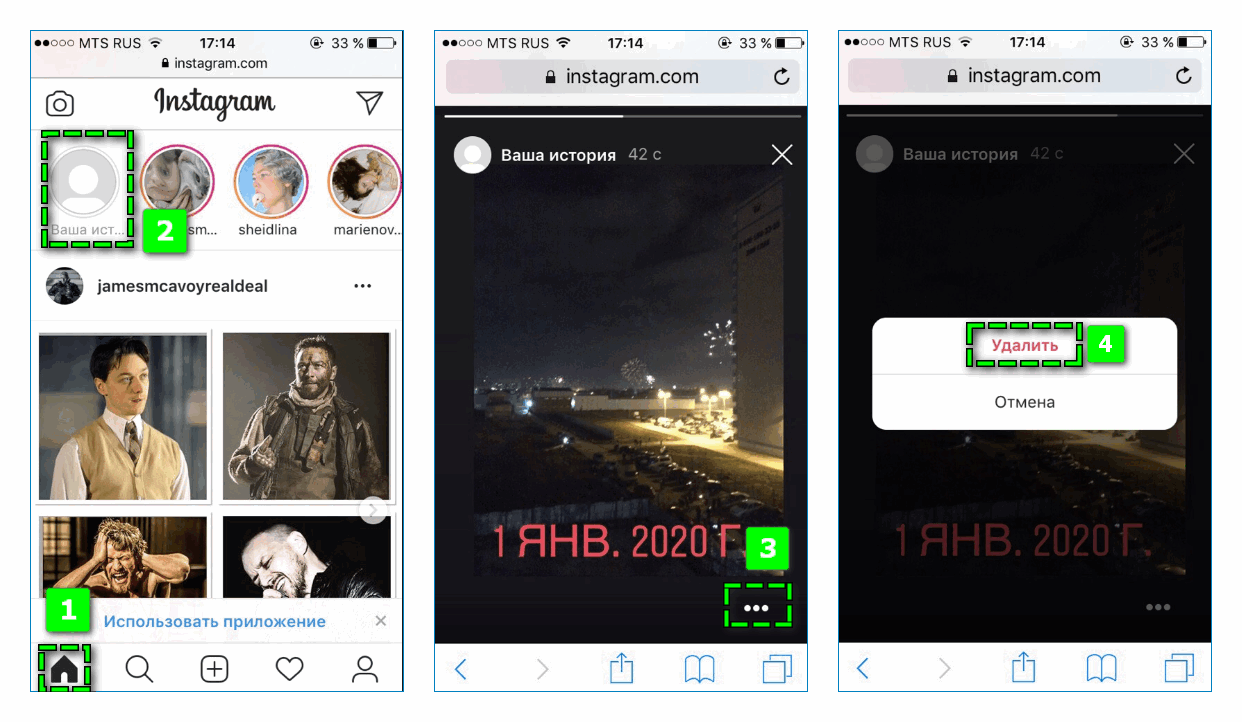На мобильных устройствах необходимо перейти в «Истории» и кликнуть по трем точкам снизу – «Удалить».