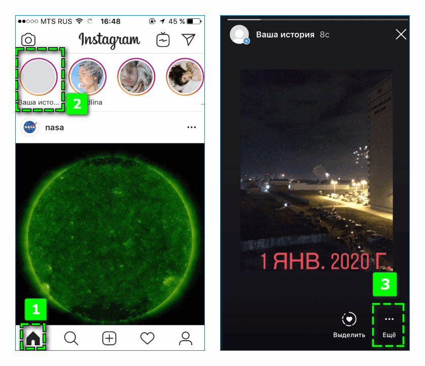 Если, наоборот, хотите сохранить созданное (не только в ленте и потом в архиве), в том же «Еще» выберите «Сохранить фото/видео» — так оно появится в галерее в вашем телефоне.