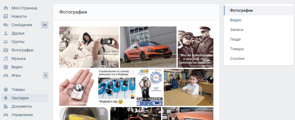 Готово, перейдите по этой кнопке. В меню справа отфильтрованы закладки по категориям – фото, видео, записи, люди, товары и ссылки. Так будет легче найти нужный материал.