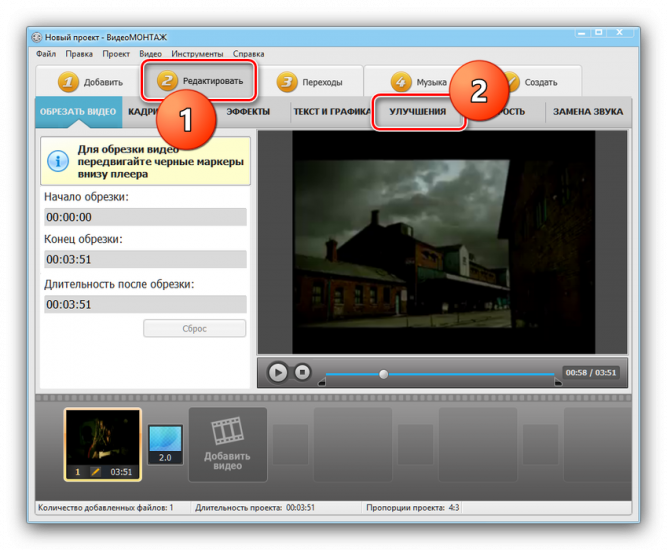 После выбора и загрузки целевого видеоролика в панели вкладок выберите «Редактировать» – «Улучшения».