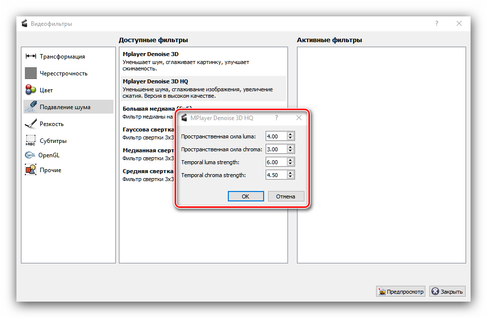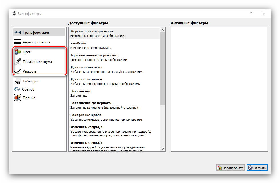 За улучшение качества ролика отвечают три категории фильтров: «Цвет», «Подавление шума» и «Резкость».