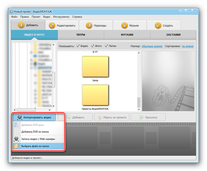 Допустим, у вас на ПК уже есть готовый ролик, но вас не устраивает качество изображения. Загружаем нужный файл в саму программу для его редактирования.