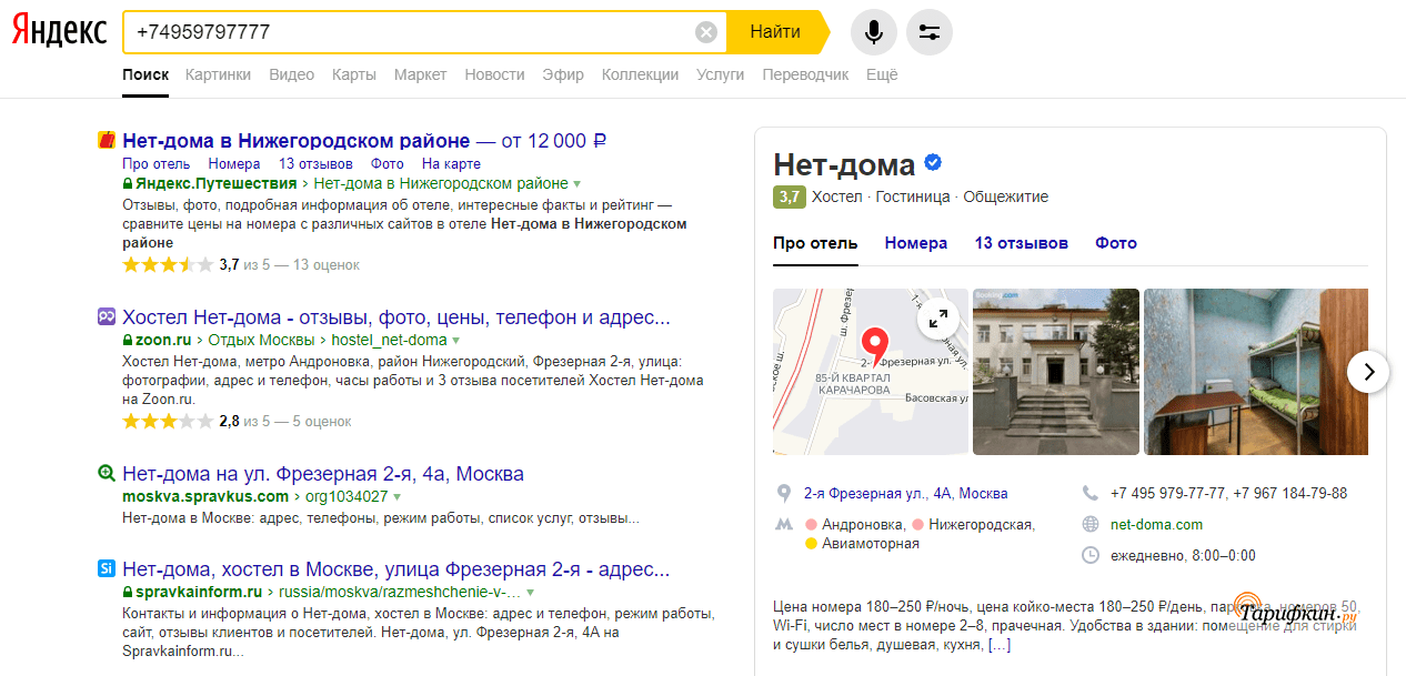 Уточнить адрес по номеру телефона поможет поисковая система Яндекс. Она хранит немыслимое количество информации, в том числе и данные по организациям. Воспользуемся этим хранилищем и попробуем найти адрес какой-либо компании, зная только её номер телефона – вводим его в поисковую строку и получаем нужные данные. В качестве примера мы вбили номерок одной гостиницы (не реклама) и получили её адрес. Здесь же указаны другие данные: