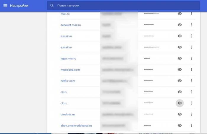 5.Мы видим все текущие сохраненные аккаунты и данные к ним. Чтобы посмотреть, что скрыто вместо точек, кликаем на значок с изображением глаза;