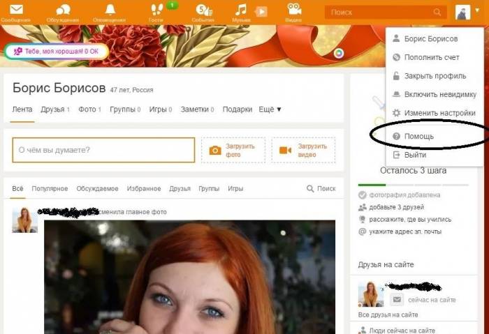 Для этого необходимо нажать курсором на свою фотографию в верхнем правом углу экрана и выбрать раздел «Помощь»