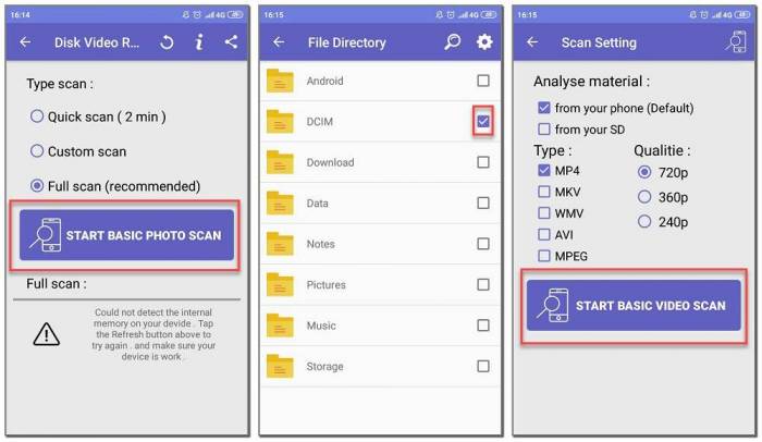 - После этого выбираем тип сканирования – простое или углубленное. Во втором случае программа отыщет больше файлов, однако сам процесс диагностики значительно увеличится. Поэтому сначала можно попробовать обычный анализ, а если он не принесет положительных результатов, перейти на углубленный. Пока данные восстанавливаются, ни в коем случае не отсоединяйте мобильное устройство от ПК, так как это может привести к окончательной потере удаленного видеоконтента.