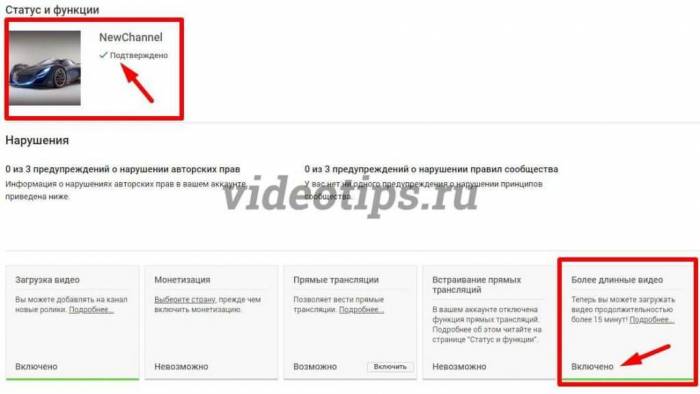 В открывшейся вкладке карточка «Более длинные видео» подсвечена зелёным и имеет подпись: «Включено». Также, возле фотографии профиля появился статус: «Подтверждено».