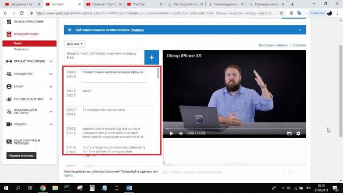 Здесь уже предварительно есть текст, сгенерированный алгоритмами YouTube. Для получения хороших субтитров чаще всего достаточно просто его отредактировать, кое-где исправив неточности и знаки препинания.