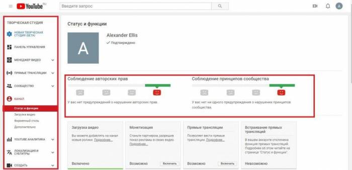 Добавленный таким образом ролик вы тоже можете отредактировать, для этого нужно зайти в «Творческую студию». На этой странице собраны все настройки канала, а также информация о рейтинге и статистике.