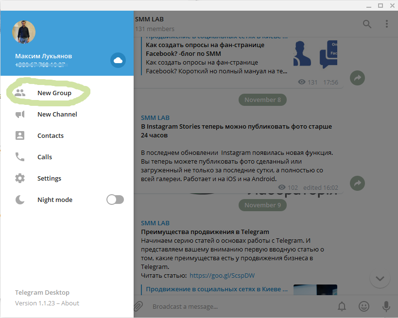 Теперь давайте рассмотрим, как создать каждый вид чатов в мессенджере Telegram.