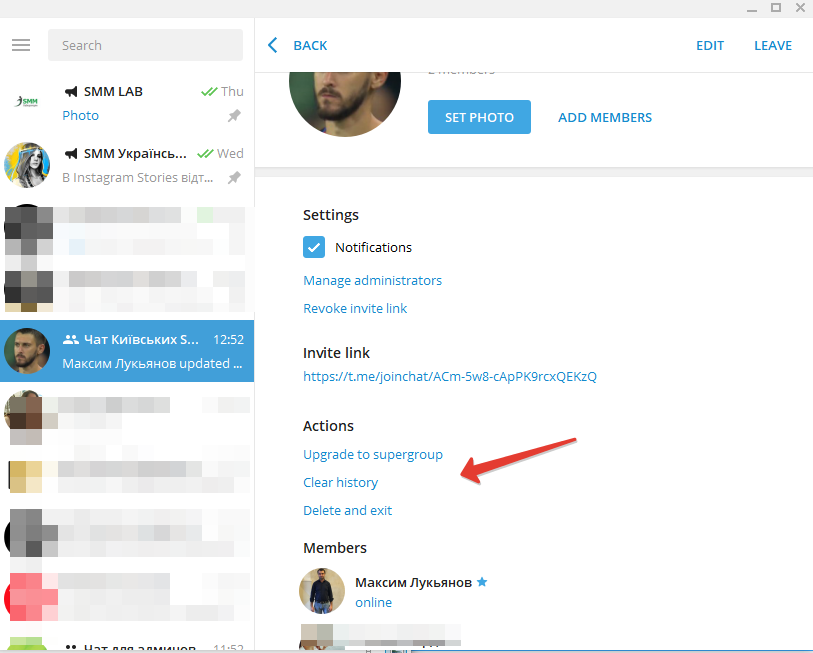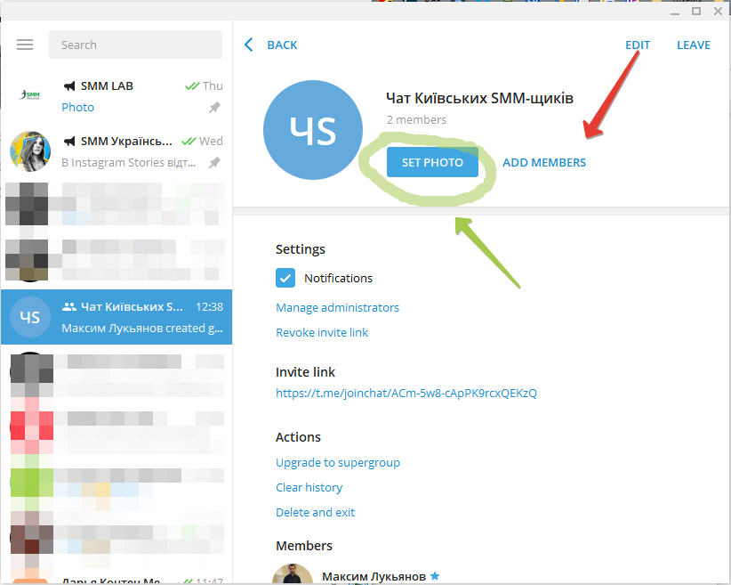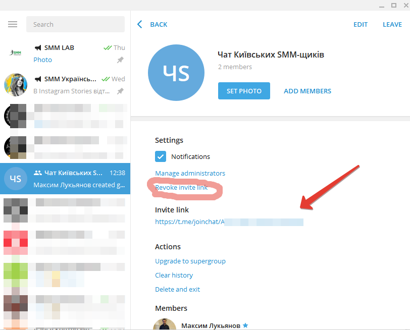 - На десктопе кликнуть «Create an invite link». После этого автоматически сформируется строка вида https://t.me/joinchat/ с произвольным набором символов. Также станет активна опция «Revoke» — аннулирование текущего кода. Это может понадобиться в том случае, если приглашение распространилось, и в группу стали попадать нежелательные участники. Аннуляция уничтожает текущий код и формирует взамен новый.