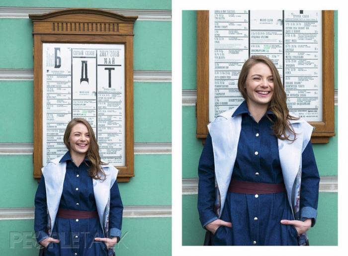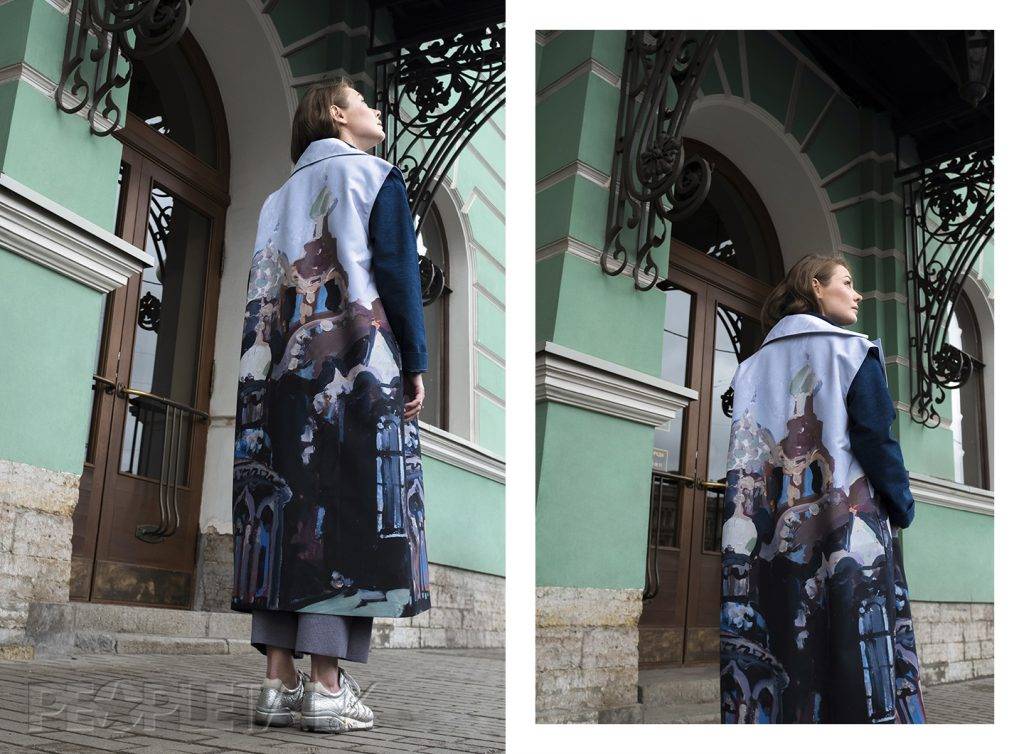 На Карине: джинсовое платье (19 990 р.), жилет «Живопись» (17 900 р.), пояс (3800 р.) – все Natali Leskova. Уже пять лет Натали отшивает вещи с фотопринтами видов родного Петербурга, а не так давно она стала отрисовывать принты маслом.