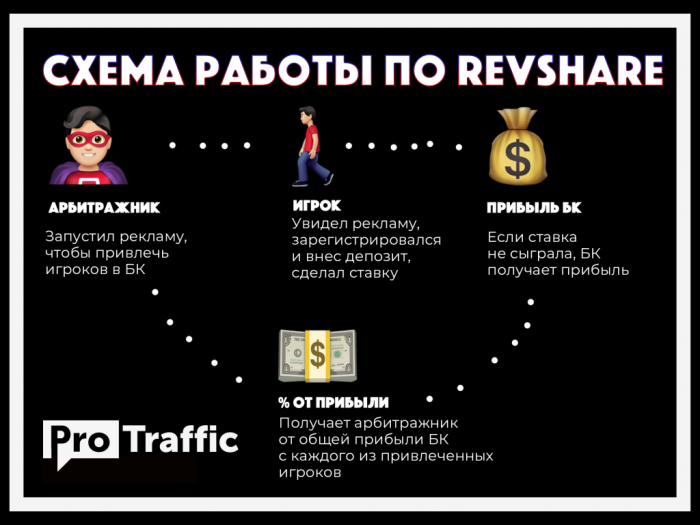 RevShare — это модель оплаты, по которой арбитражнк получает фиксированный процент от дохода букмекерской конторы. По этой схеме игрок все также регистрируется по специальной ссылке, пополняет баланс и делает ставки. Если он проигрывает, арбитражник получает процент от суммы слитых игроком средств.