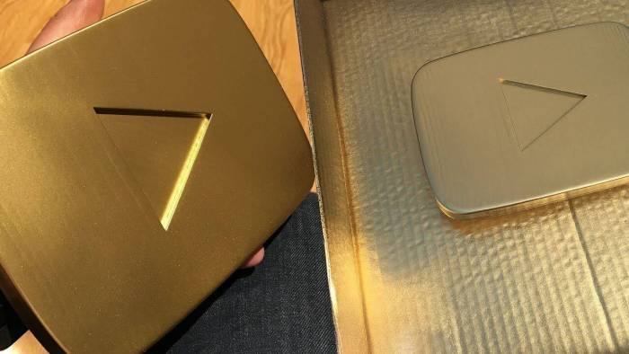 Вторая награда — золотая кнопка ютуба сделана из латунного сплава для блогеров, подписавших 1 миллион пользователей. Высылают по почте с 2012 года.