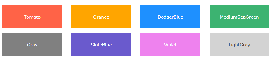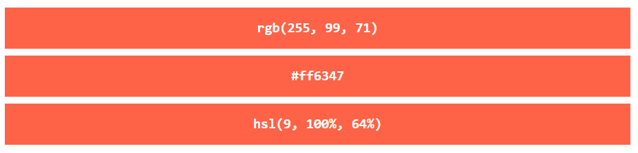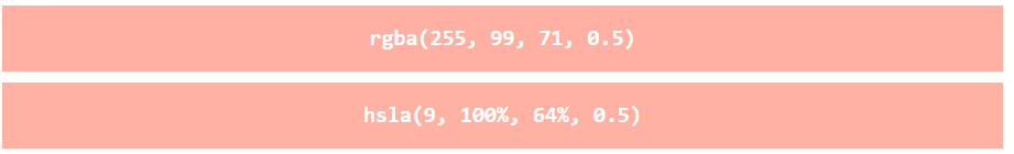 | 1 | <h1 style=»background-color:rgb(255, 99, 71);»>…</h1> <h1 style=»background-color:#ff6347;»>…</h1> <h1 style=»background-color:hsl(9, 100%, 64%);»>…</h1> <h1 style=»background-color:rgba(255, 99, 71, 0.5);»>…</h1> <h1 style=»background-color:hsla(9, 100%, 64%, 0.5);»>…</h1> |