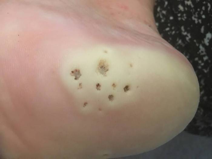 У бородавок подошвенного типа корни очень глубокие, а на поверхности хорошо просматривается рисунок сосудов. По этому типу отлично рассмотреть, каким может быть корень бородавки. В молодых наростах — это белые точки, в старых – черные. Удалить их самостоятельно затруднительно.