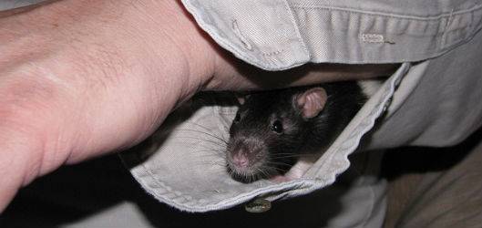 Маленький крысенок любит ползать за пазухой хозяина, в рукавах кофты или халата. Малыш ощущает родной запах, ему комфортно от тепла человеческого тела и не страшно в новых условиях. Питомец будет высовывать носик из горловины или рукавов, желательно в эти моменты ласково разговаривать с малышом и гладить его.