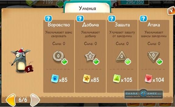 Первая характеристика – это Атака. Чем она выше, тем проще вам закормить противника до смерти. Следом за Атакой у нас идет Защита. Чем этот параметр выше, тем лучше ваши зверюшки противостоят обжорству. Последние две характеристики – это Воровство и Добыча. Первая увеличивает шанс скрысить сыр, а вторая увеличивает количество награбленного в рейдах на вражескую территорию.