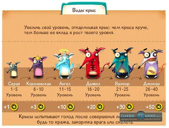 У местных грызунов тоже есть своя ранговая система. На нижней ступеньке стоят серые крысы, следом за ними идут королевские, затем – крыса-ангел и крыса-дьявол, потом крыса-вампир, и на самом верху – крыса-Джокер. Прокачивать до максимального уровня их сложно, но результат того стоит.