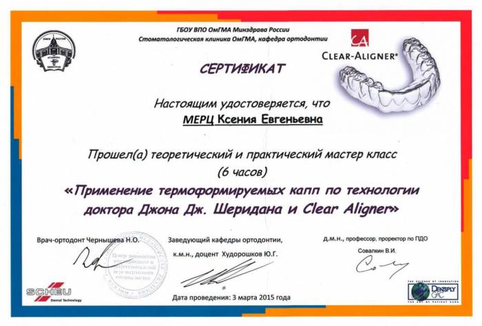 2015 г.- «Применение термоформируемых капп по технологии доктора Джона Дж. Шеридана и Clea Aligner».